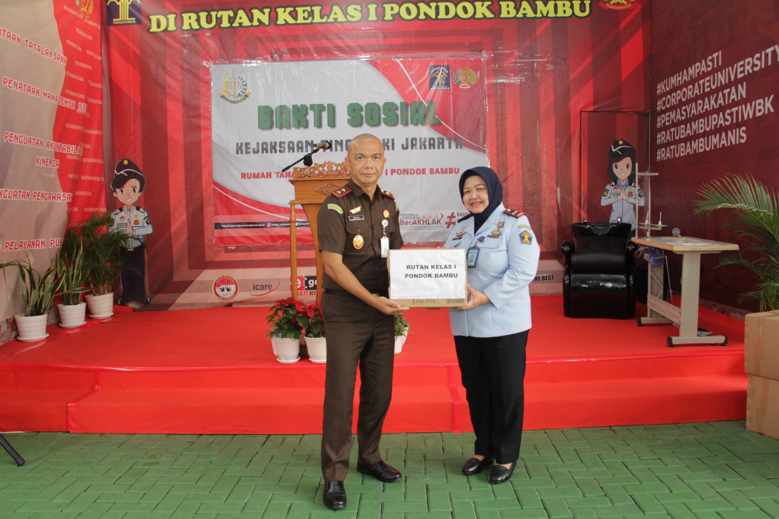 Dalam acara bakti sosial tersebut, Kajati DKI langsung menyerahkan bantuan sejumlah alat pendukung mengasah keterampilan, seperti satu buah kursi keramas untuk salon, satu buah oven, dua buah kompor besar, dua buah manekin dan 500 buah peralatan mandi.